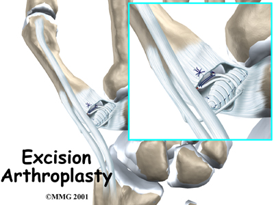 The traditional operation for treating CMC joint arthritis is . This method has been used for many years and has withstood the test of time. The purpose of excision arthroplasty is to remove the arthritic joint surfaces of the CMC joint and replace them with a cushion of material that will keep the bones separated. Most surgeons use a piece of tendon that has been rolled up and placed into the space created by removing the bone surfaces. During the healing phase after surgery, this tendon turns into tough scar tissue that forms a flexible connection between the bones, similar to a joint.