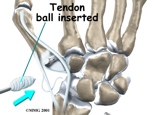 Then the doctor removes a small section of one of the tendons near the thumb. The piece of tendon is and placed into the space where the trapezium bone was removed. The remaining portion of the tendon is sewn to the thumb metacarpal to stabilize the joint. The surgeon may also insert a surgical pin to connect and hold the metacarpal bones of the thumb and index finger. The pin protects the reconstructed joint and is usually removed three weeks after the surgery.