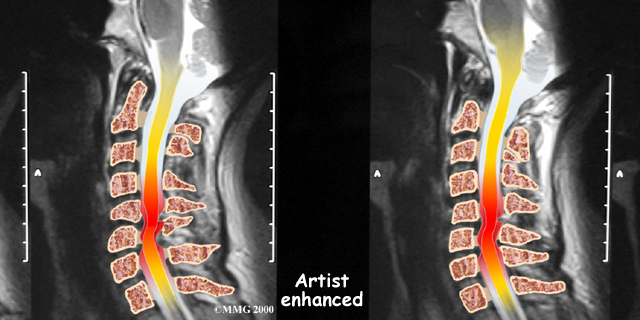 The changes that happen with degeneration and disc herniation can choke off the blood supply that goes to the spinal cord. The sections of the spinal cord that don't get blood have less oxygen and don't function normally, leading to symptoms of myelopathy.